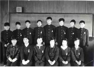 ◆またもや私これは犯罪か?私(後列右から2番目)より,前列の女の子の方に目が行ってしまう。中学1年か2年の3学期。通知簿をもらった後,音楽室に集合して撮った記念写真。器楽部(当時はこう呼んでいた)のメンバー全員集合。今でも一緒にバンド活動している人が,この中に一人います。誰でしょう。SMOのメンバー紹介の写真を見れば,すぐわかるはず。(1964or5) |
