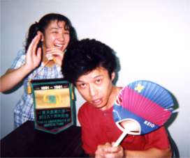 ◆伝説の巨人シモンこのお方が伝説のお方『シモン』。塾OBの方々の中には,今では伝説となっておられる人物が数多くおられます。シモンはその一人。伝説度(?)では,5本の指に入る。なんと,大学で8年間も数学を研究しておられた方です。在籍当時から,彼の言動は「常軌を逸する寸前」状態でした。彼と話していて,腹をかかえて,あごをはずして笑うこと,何万回。『ベストコンディションが最悪』は彼の持ちネタです。私もときどき使わせていただいています。彼は,この後紹介する写真の中にも再度登場します。 後ろの女性も,いまや伝説となりかけているお方。『HなOL』さんです。彼女,このとき,まだ高3だったようです。伝説の巨人シモンとのトゥー・ショットで,最高に盛り上がってます。(1997) |