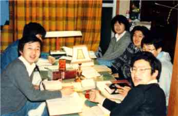 ◆理由あって私のアパートでの勉強会当時,塾のあった惇明ビルで盗難騒ぎや,シンナー常習者の乱入などがあって,夜危ない,というので,拙宅で夜勉強会を開いた。彼らは当時高校3年生。右端から,みっちゃん,やく,やっさん,わたる,とっさん,ながい。確か,「おだち」も来てたよう。彼らは,塾史に残るほど,勉強熱心やった。私とちょうど一回り歳が違うので,なぜか可愛かった記憶がある。もう20年くらい会ってへんなあ。お~い,いっぺん,同窓会やろうぜ。(1981秋) |